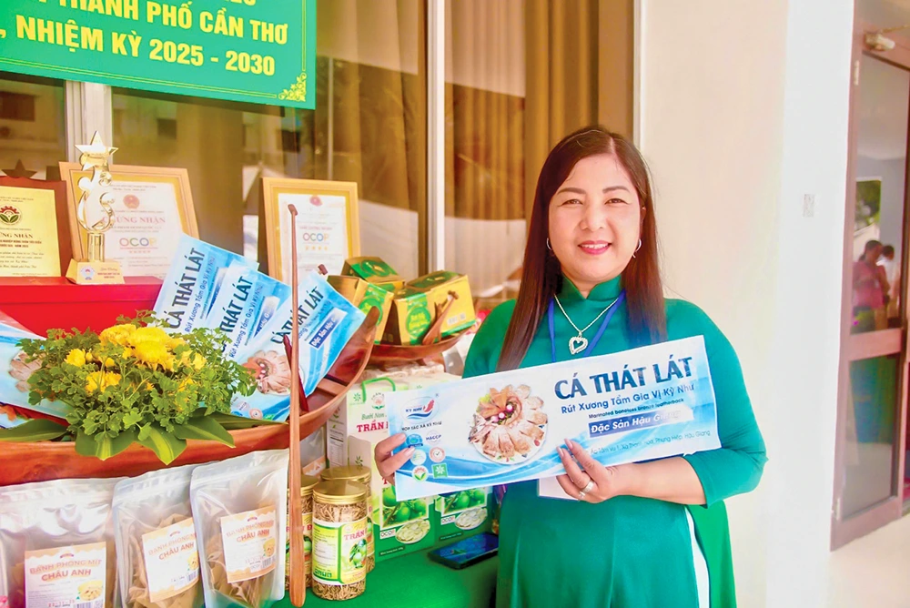 Bà Nguyễn Kim Thùy bên sản phẩm Cá thát lát rút xương tẩm gia vị Kỳ Như đạt chuẩn OCOP 5 sao cấp quốc gia. Ảnh: ĐANG THƯ