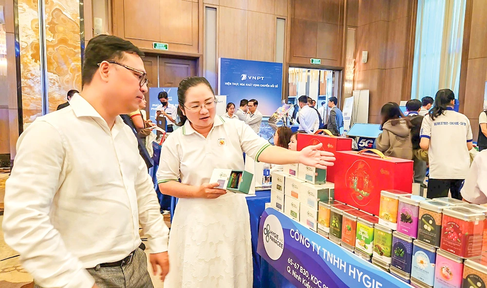 Chị Đoàn Thị Hồng Thắm quảng bá sản phẩm tại một sự kiện do thành phố tổ chức. Ảnh: MỸ THANH