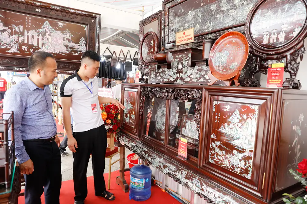 | Tại hội chợ, các chủ thể sản xuất đều trưng bày, quảng bá, bán những sản phẩm đặc sắc, nổi tiếng nhất của đơn vị mình. Ảnh: Các sản phẩm đồ gỗ khảm ốc siêu kỹ, mỹ thuật của Nghệ nhân Nhân dân Nguyễn Đình Vinh, xã Liên Bão. |