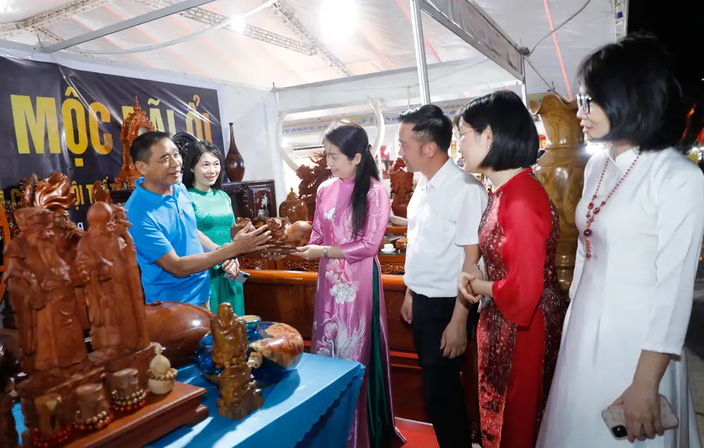 | Đêm khai mạc, hội chợ đã thu hút hàng nghìn người dân đến tham quan, mua sắm. Ảnh: Đồng chí Phạm Văn Thịnh, Ủy viên Ban Thường vụ Tỉnh ủy, Phó Chủ tịch UBND tỉnh cùng các đại biểu thăm gian trưng bày sản phẩm bon sai nghệ thuật làm bằng dây đồng của hộ kinh doanh Lê Xuân Thường, tổ dân phố Nội Trung, phường Trạm Lộ. |