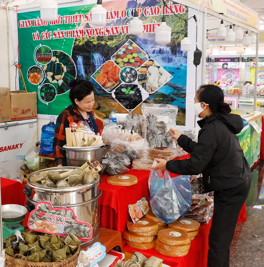 | Khách mua các sản phẩm bánh chế biến từ gạo của tỉnh Cao Bằng. |