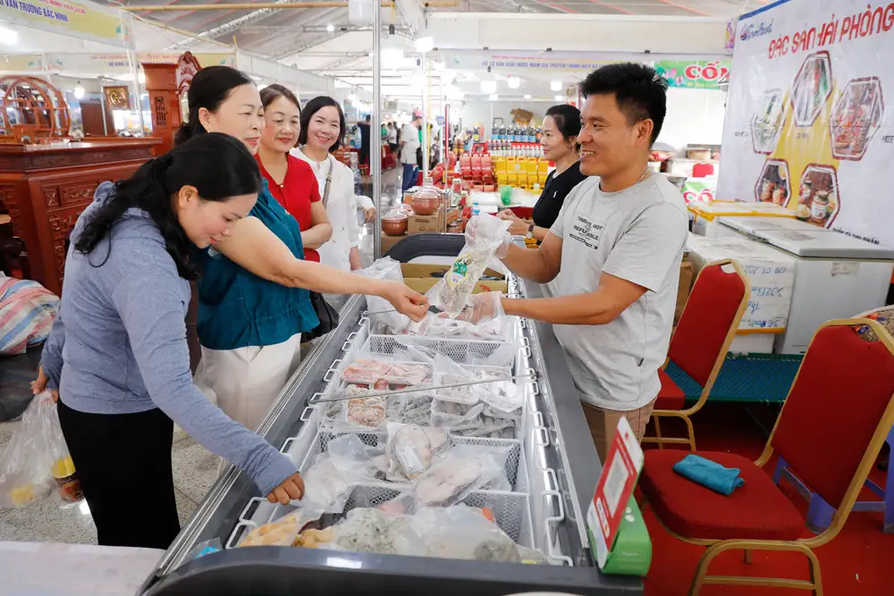 | Hội chợ còn có sự tham gia của nhiều thành phố, tỉnh bạn với hàng trăm loại đặc sản, sản phẩm vùng miền cao cấp. Ảnh: Người dân mua hải sản chế biến tại gian trưng bày sản phẩm OCCP của Thành phố Hải Phòng. |