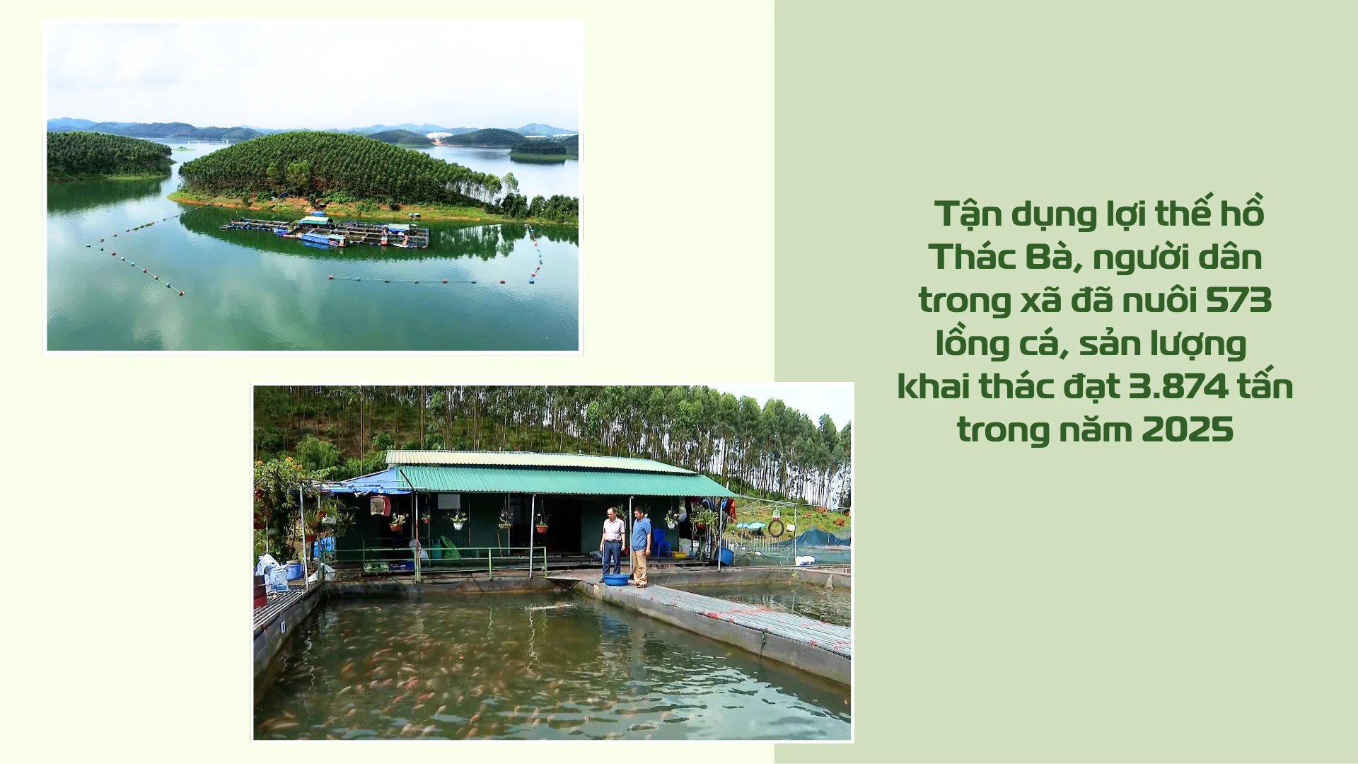 Bên cạnh trồng trọt, chăn nuôi cũng được xã quan tâm phát triển với tổng đàn gia súc trên 48.200 con, gia cầm gần 260.000 con, sản lượng thịt hơi xuất chuồng đạt 2.084 tấn. Hoạt động thủy sản trên hồ Thác Bà cũng góp phần đáng kể vào thu nhập người dân với 573 lồng nuôi cá, sản lượng nuôi, khai thác đạt 3.874 tấn trong năm 2025.